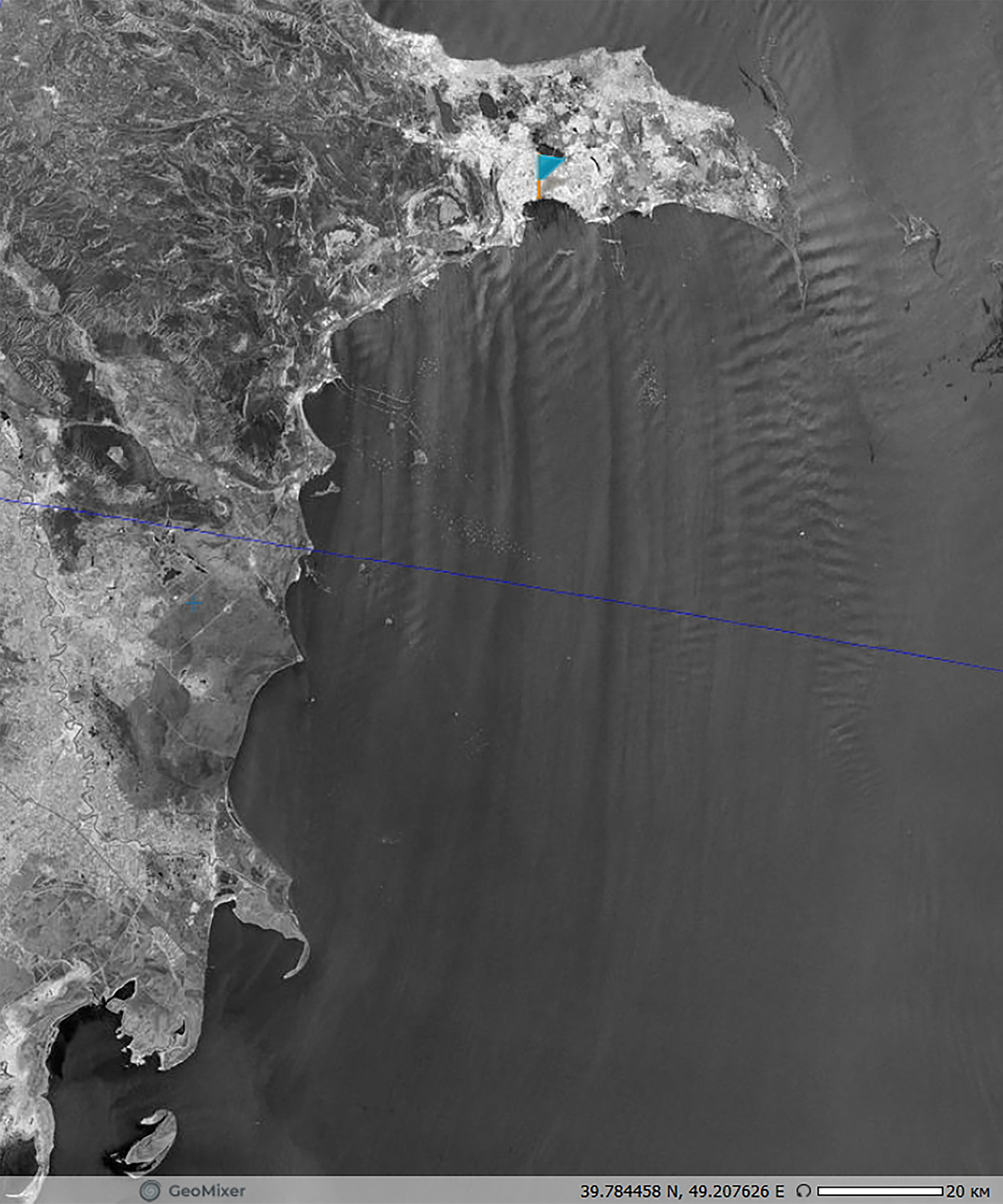 Рис. 10. Бакинский норд (бороподобный северный ветер) в юго-западной части Каспийского моря, отобразившийся на РЛИ спутника Sentinel-1A от 08.11.2017 в 14:37 UTC (флажком показан г. Баку). © ESA