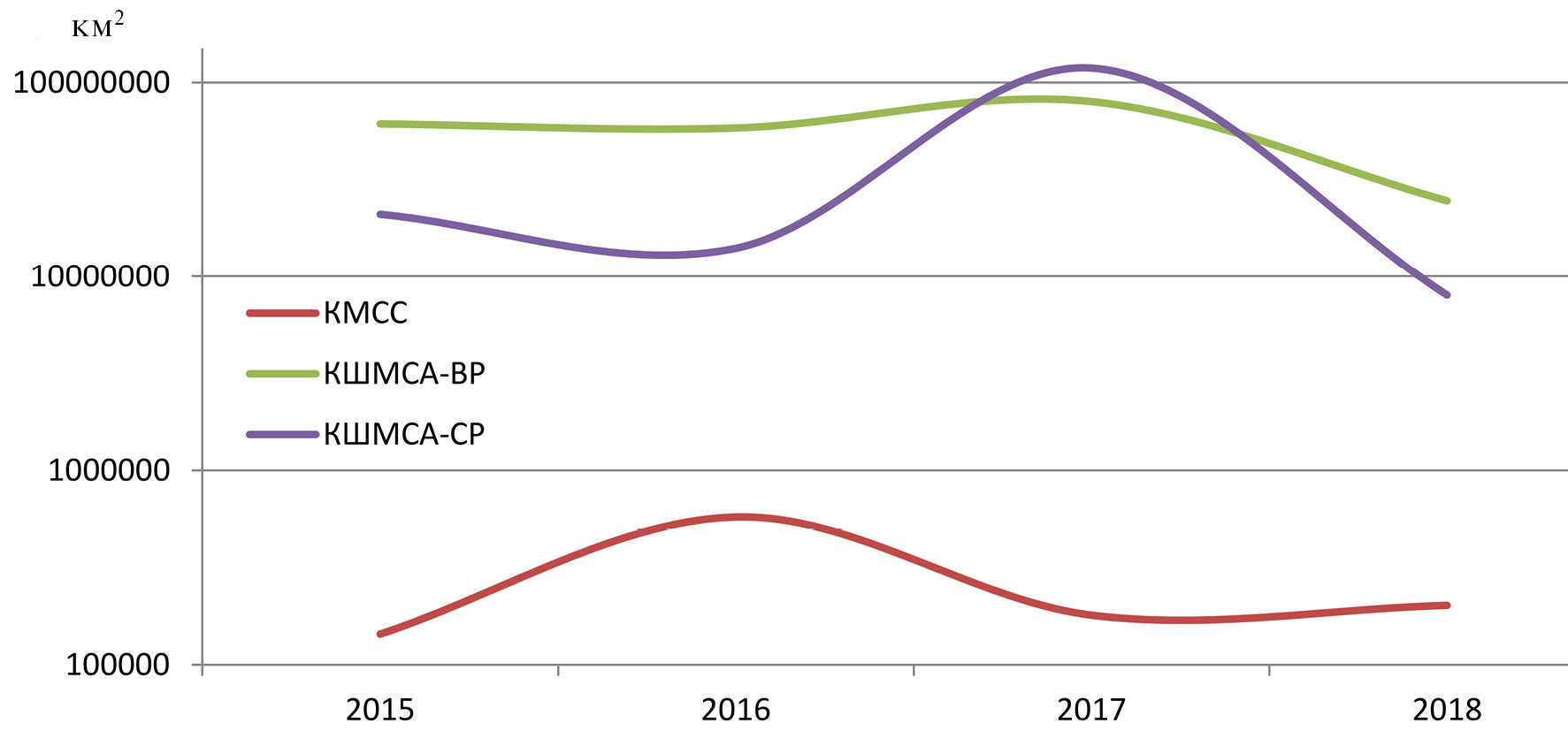 Динамика заявляемых площадей на мультиспектральную съемку среднего разрешения (на основе анализа заявок в НЦ ОМЗ) с КА «Ресурс-П» и «Метеор-М» показывает, что наибольшим спросом пользуются данные КШМСА (рис. 2). При этом в 2017 г. спрос на данные среднего разрешения превышал спрос на данные высокого разрешения, что объясняется большим количеством заявок со стороны МЧС России. В 2018 г. отмечается существенное снижение спроса, особенно на данные КШМСА-СР. В отношении данных КМСС спрос за 2015–2018 гг. довольно стабилен, при этом в абсолютном выражении на два порядка уступает спросу на данные КШМСА. Пик 2016 г. связан с запросом Института космических исследований РАН, который в дальнейшем данные КМСС практически не заказывал.