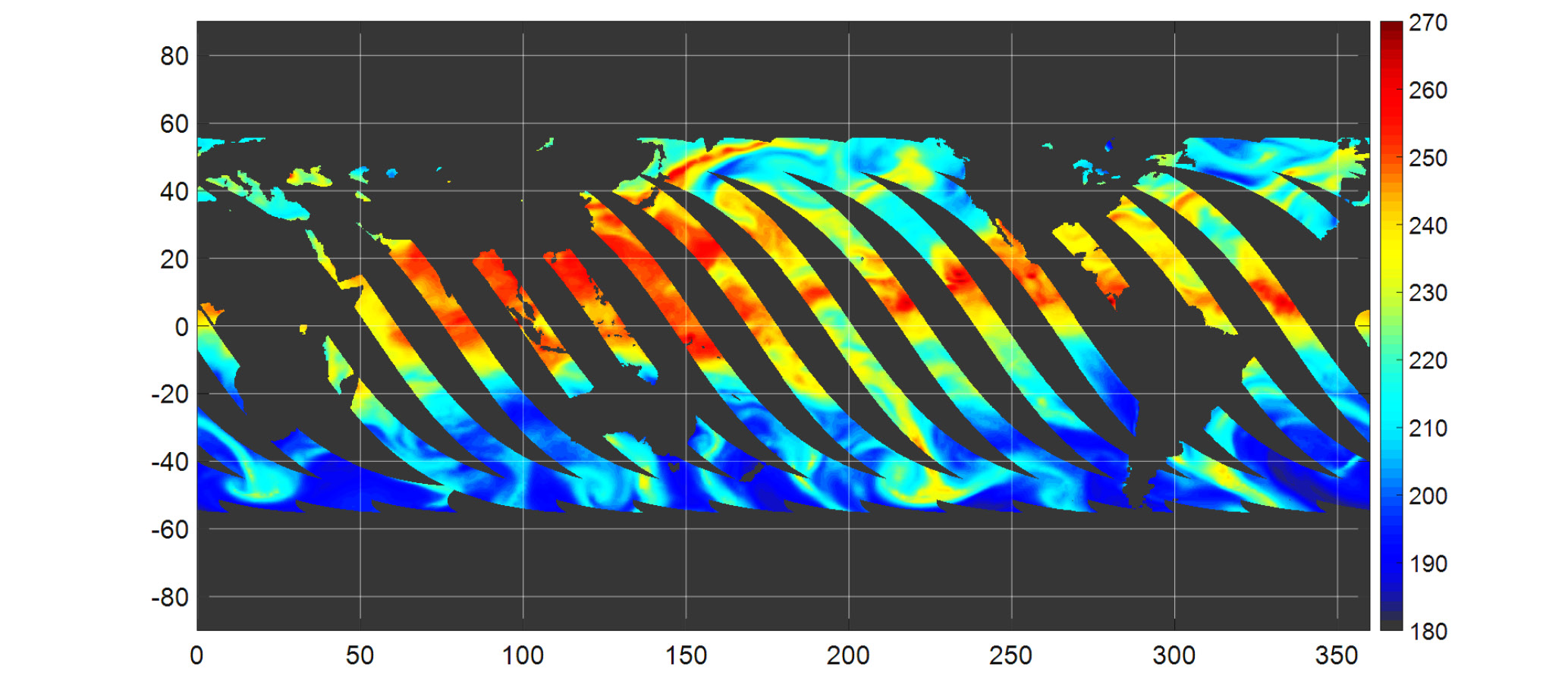 Рис. 1. Поле яркостных температур комплекса МИРС на частоте 24 ГГц (В) для нисходящих витков МКС полученное в результате моделирования.