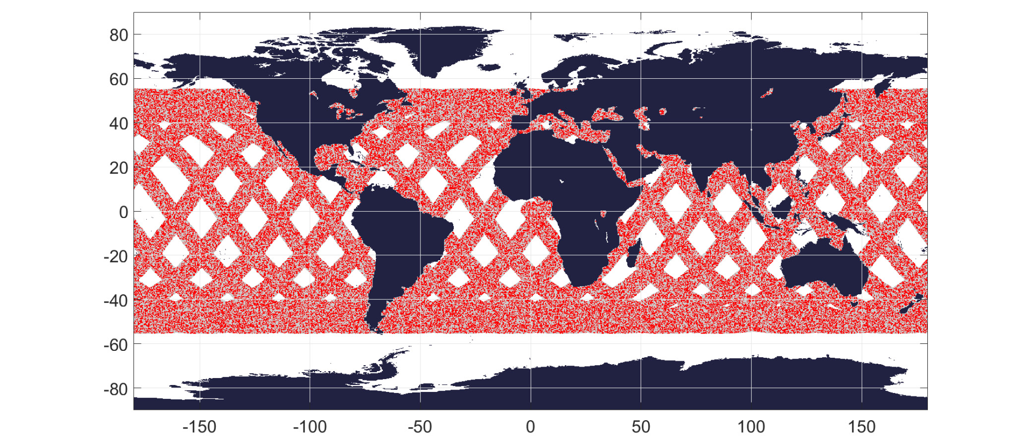 После этого была рассчитана геометрия сканирования прибора МИРС. Установка прибора планируется на российском сегменте МКС, поэтому при расчетах использовались основные параметры ее орбиты: высота орбиты 410 км, наклонение орбиты 51.6 °. МИРС имеет конический тип сканирования с двумя секторами обзора вперед и назад относительно траектории полета. Угловой размер секторов сканирования составляет по 120° в каждом направлении, что при угле встречи с Землей в 53.1° обеспечивает ширину полосы сканирования на поверхности Земли порядка 830 км. С учетом всех этих параметров были рассчитаны координаты центров пятен диаграммы направленности антенной системы МИРС на поверхности Земли для восходящих и нисходящих витков станции. Из данных реанализа были выбраны пиксели, соответствующие координатам центров пятен диаграммы направленности антенной системы МИРС. Таким образом был получен набор модельных подспутниковых измерений МИРС за одни сутки.