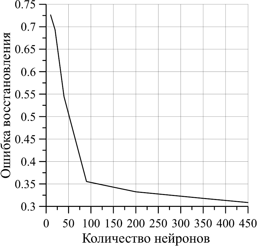 Проведенный в ходе работы эксперимент показал, что для имеющейся обучающей выборки персональный компьютер, оснащенный 8 ГБ ОЗУ, который применялся для вычислений, способен обучить ИНС прямого распространения с максимальным количеством нейронов в скрытых слоях равном 450. Это стало основным ограничением в дальнейшей работе. Из-за большого количество времени, требуемого для проверки качества обучения в зависимости от количества скрытых слоев и распределения нейронов внутри них, было решено ограничиться сетью прямого распространения с одним скрытым слоем. Далее был проведен эксперимент, в ходе которого была выявлена зависимость среднеквадратической ошибки восстановления влажности от количества нейронов в скрытом слое ИНС прямого распространения. Результат эксперимента показан на рис. 3.