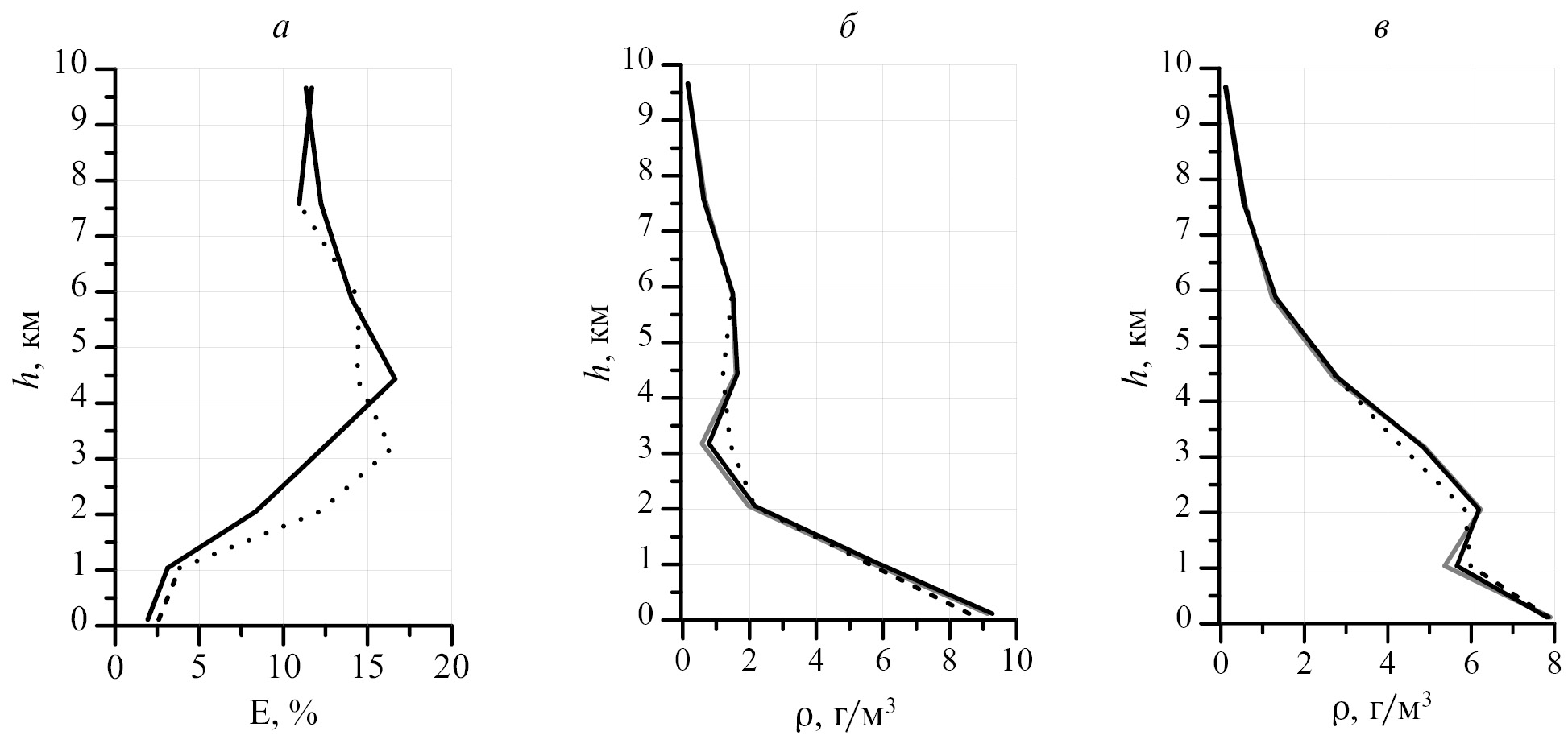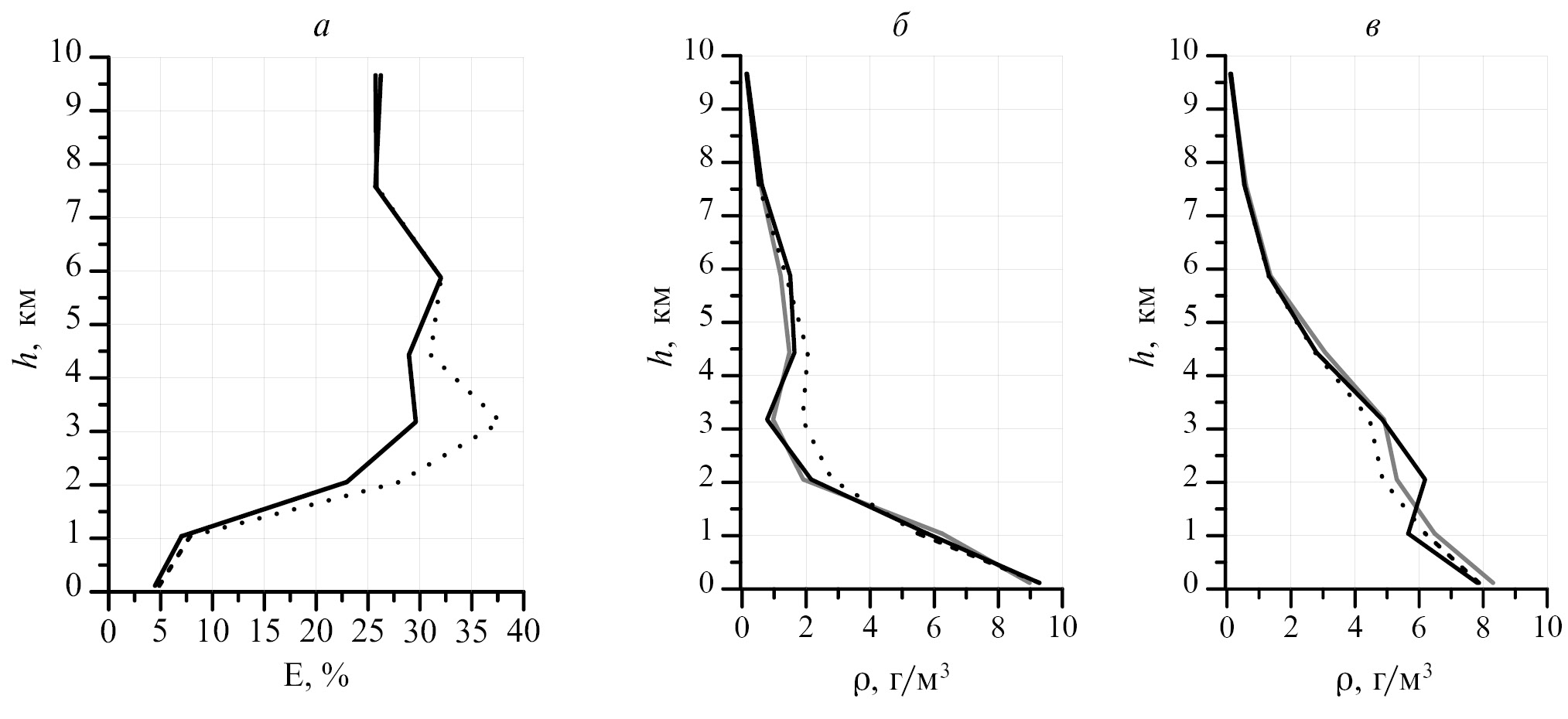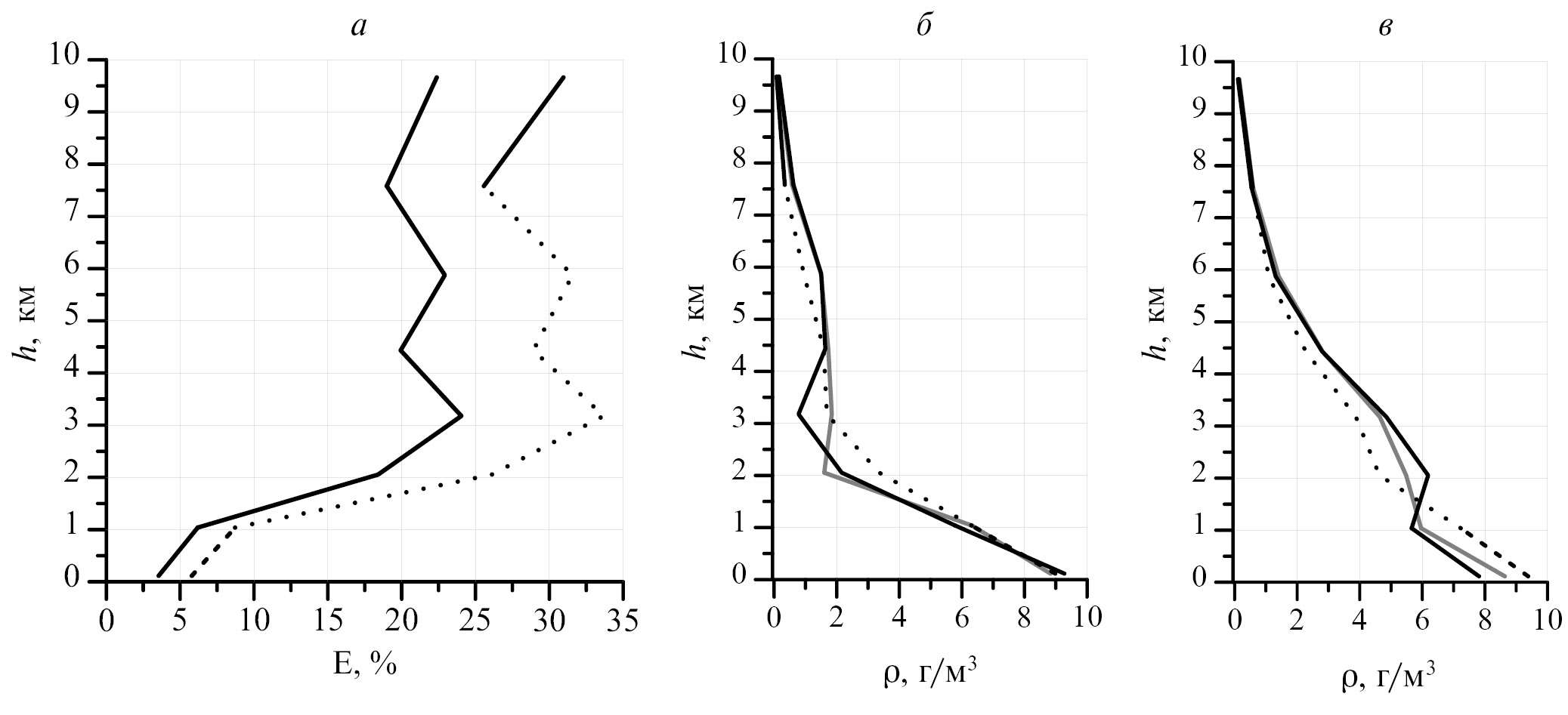 Рис. 5. а: пунктирная кривая — относительная погрешность восстановления профиля влажности при незашумленных яркостных температурах МИРС на 7 каналах 165–183.31±0.3 ГГц и при дополнительном использовании профиля температуры атмосферы; сплошная кривая — те же каналы плюс 5 дифференциальных каналов 18.7–26.5 ГГц. б и в — примеры профилей влажности с инверсиями, черная сплошная — истинный профиль, пунктирная серая — восстановленные профили на 7 каналах 165–183.31±0.3 ГГц; сплошная — 7+5 =12 каналов.