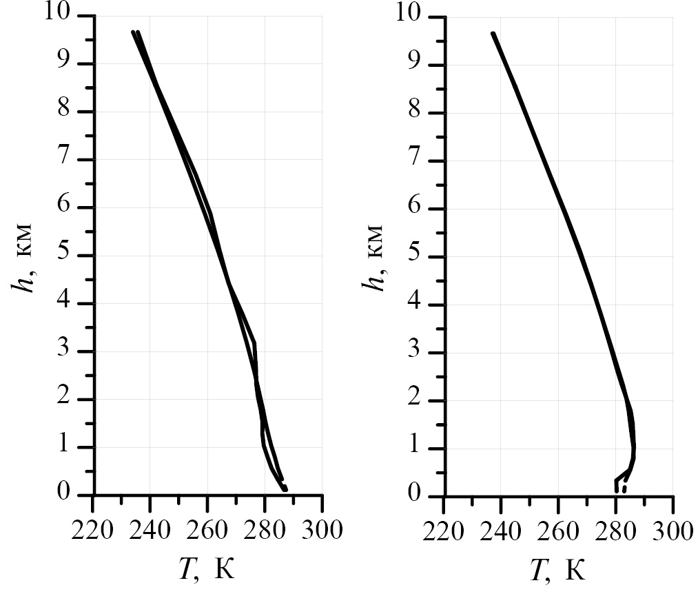 У комплекса МИРС есть возможность восстановления профиля температуры атмосферы до 15 км. Для этого используются измерения яркостных температур на 6 каналах в полосе поглощения кислорода 50–70 ГГц (Шарков и др., 2018). Проводилось моделирование задачи восстановления профиля температуры атмосферы различными методами на основе тех же выборок модельных данных, описанных в п. 2. Результаты работы показали, что в ходе КЭ “Конвергенция” можно ожидать восстановления профиля температуры атмосферы со среднеквадратичной ошибкой в тестовой выборке порядка 1.5 К, что находится на уровне мировых аналогов (Blackwell, 2005). В дальнейшей работе будем считать, что у нас уже имеются восстановленные профили температуры атмосферы для той же выборки, для которой проводится восстановление профиля влажности. Для примера на рис. 6 приведены восстановленные профили температуры для той же выборки, что представлена на рис. 4б, в и 5б, в.