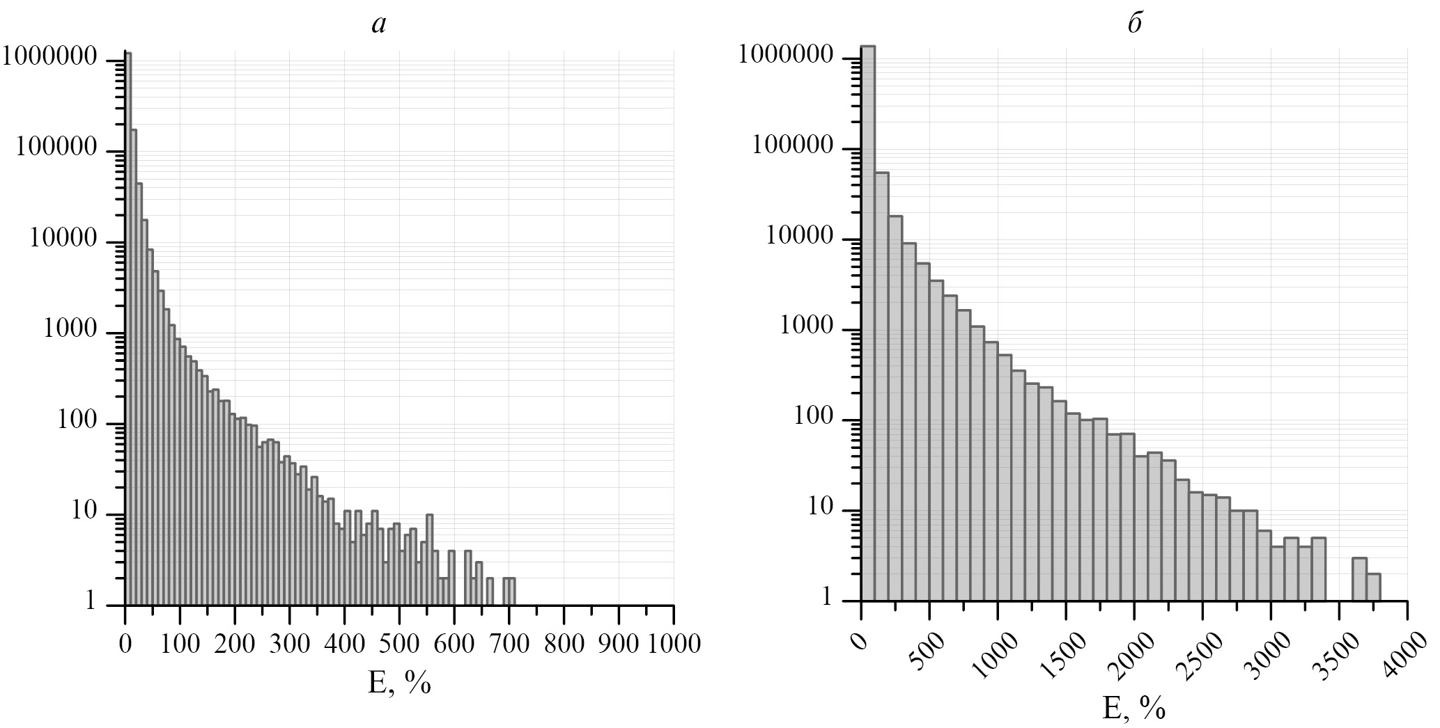 В ходе анализа распределений влажности в пикселях с ошибкой более 100%, которые представлены на рис. 9, оказалось, что подавляющая их часть содержит экстремально низкие значения влажности.