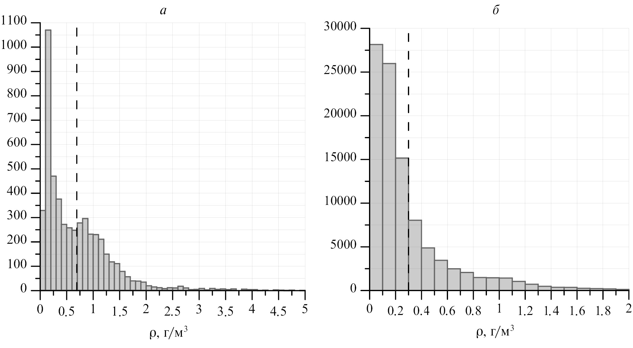 Рис. 9. Гистограммы влажности для пикселей с ошибкой восстановления более 100%: а — на высоте 1 км; б — на высоте 3 км. Пунктиром обозначено среднее значение представленной выборки.