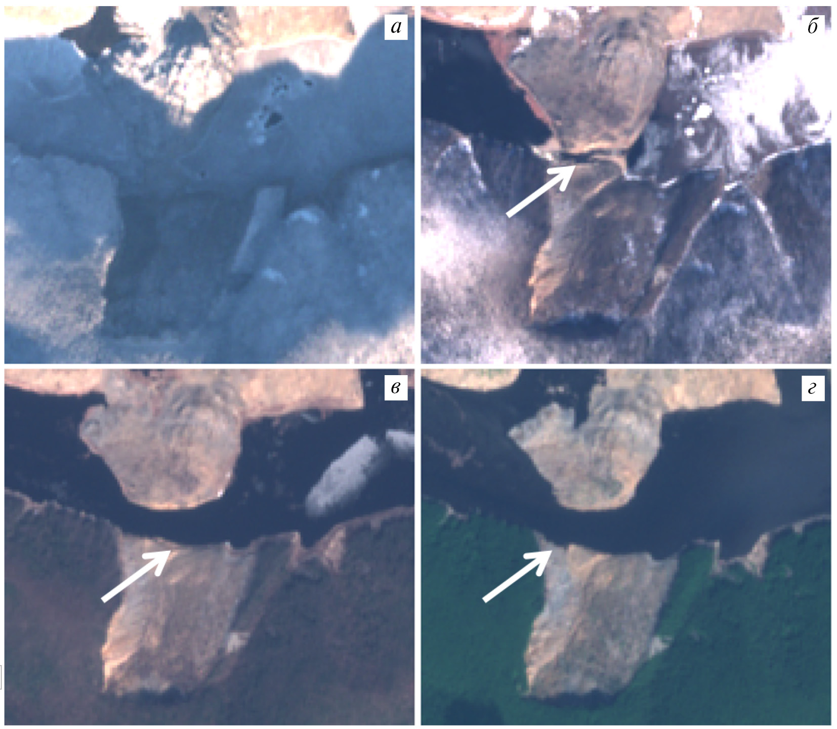 На рис. 1а приведен фрагмент оптического космического изображения оползневой зоны, полученного 12 декабря 2018 г. с борта спутника Sentinel‑2, вскоре после обрушения. Здесь из-за низкого зимнего солнца русло реки и зона обрушения трудно различимы в тени высокого южного берега. Основные изменения на земной поверхности, наблюдавшиеся после схода оползня, выделяемые на космических оптических изображениях — это: