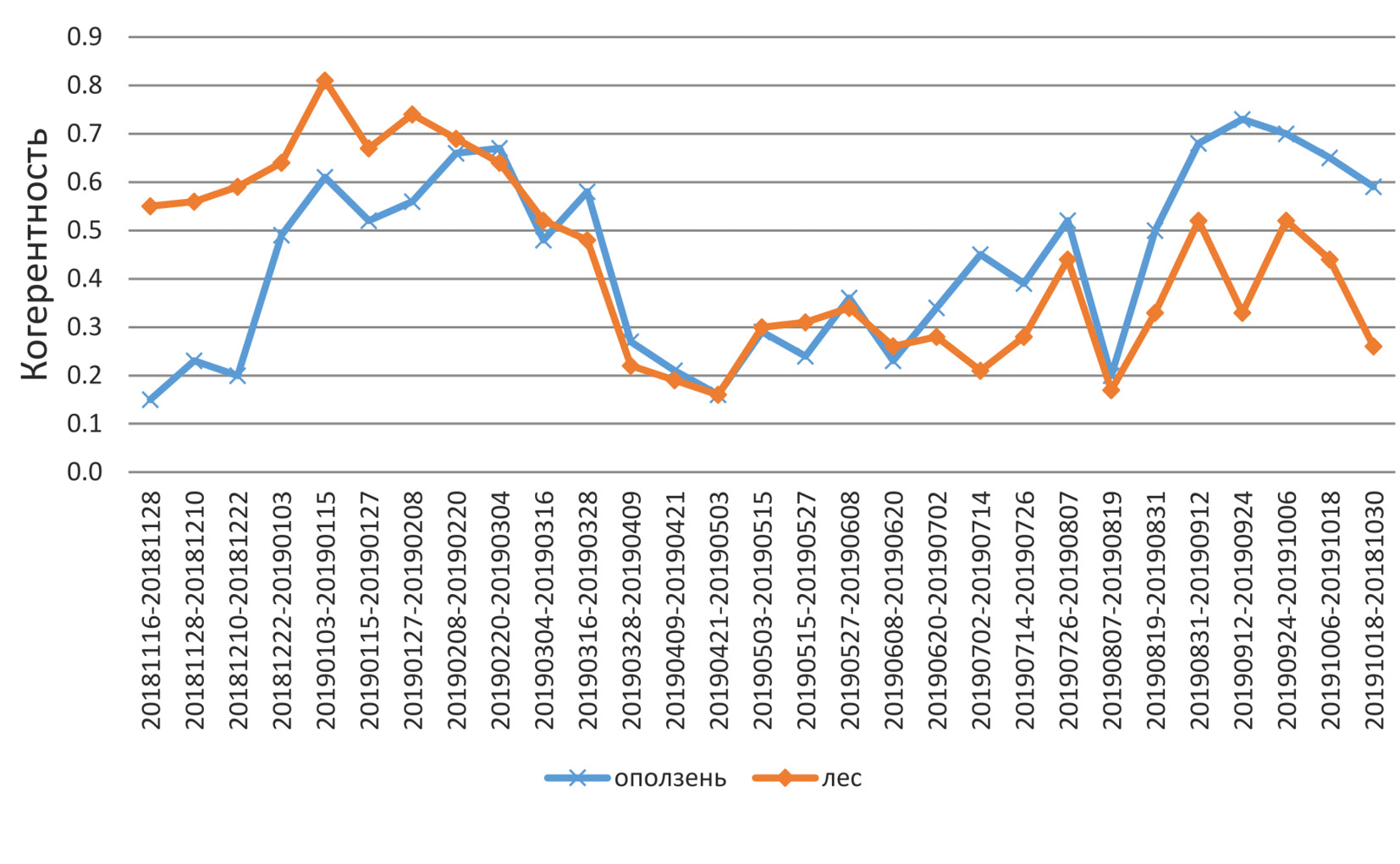 На рис. 2 приведены графики когерентности для зон оползня и близлежащего леса за период времени с 16.11.2018 по 05.10.2019. Интервал между съемками пар радарных изображений обусловлен 12-дневным периодом точного повторения орбиты спутника. Даты по горизонтальной оси приведены в формате годы–месяцы–дни.