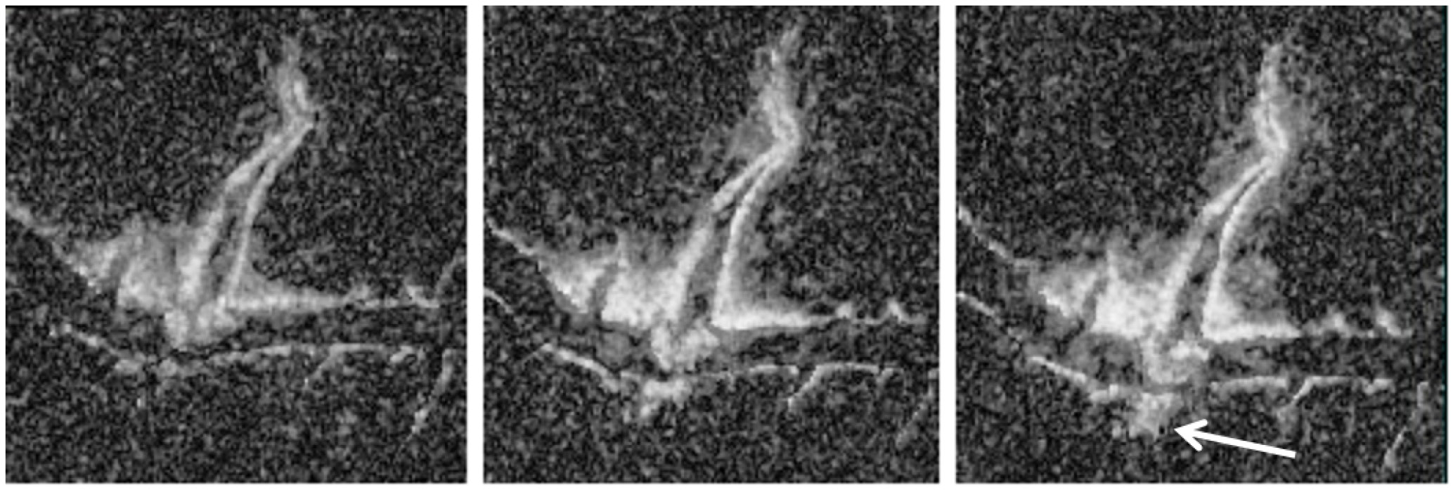Рис. 3. Когерентность радиолокационных сигналов для участка земной поверхности в мае, июне и июле 2019 года. Стрелкой указана оползневая зона.