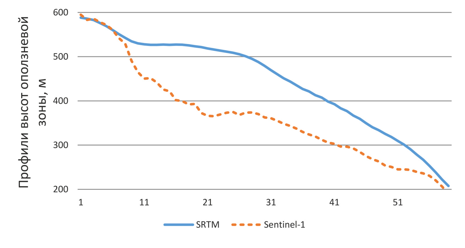 На рис. 4 приведен профиль высот поверхности оползневой зоны вдоль по склону, построенный по данным интерферометрической съемки Sentinel‑1 в январе 2019 г. (пунктирная линия), и профиль, извлеченный из ЦМР SRTM (сплошная линия). По вертикальной оси отложена высота над уровнем моря в метрах, по горизонтальной — номер отсчета профиля (пиксела). Расстояние между пикселами на поверхности составляет около 14 м.