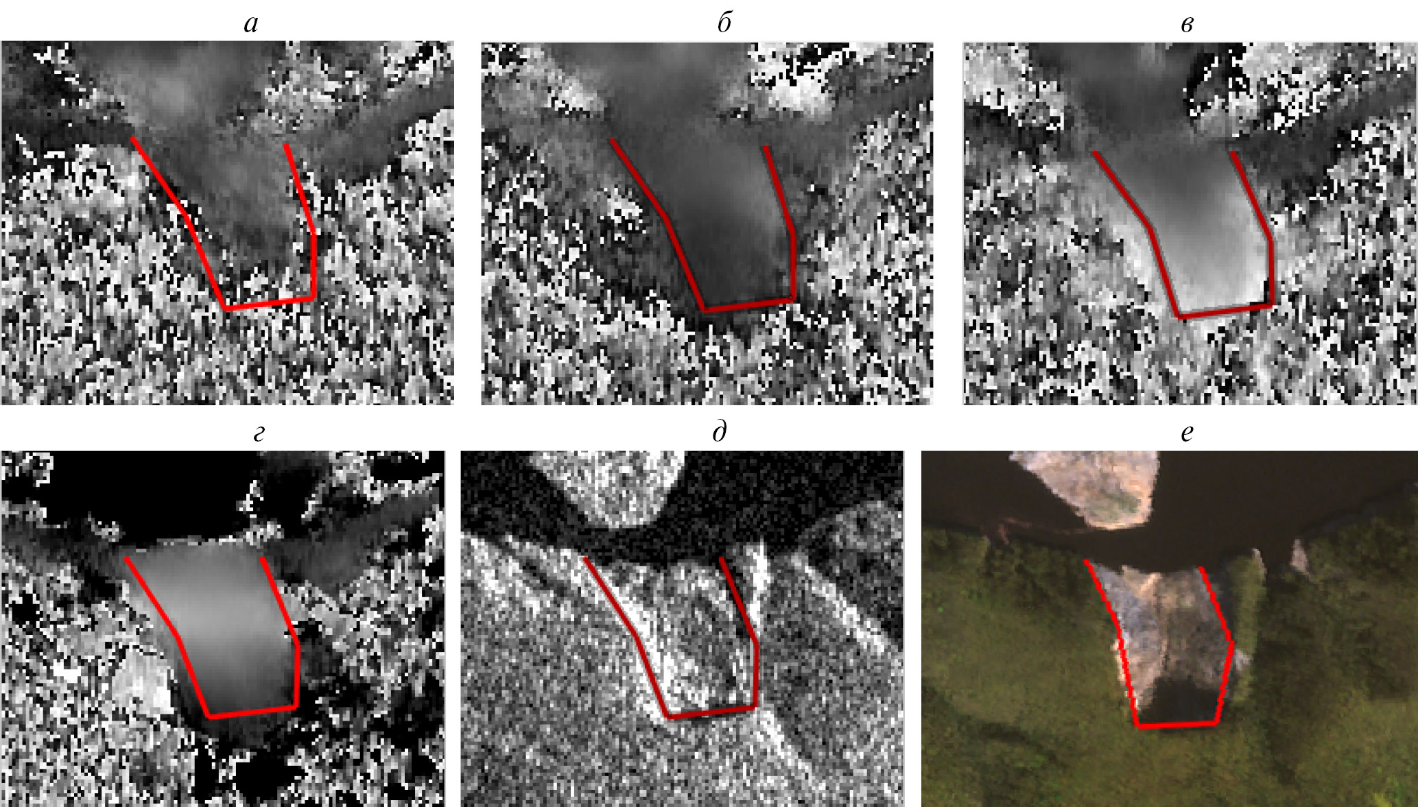 Рис. 5. Примеры интерферограмм (а–г) и космических изображений (д, е) для оползневой зоны по данным съемки РСА Sentinel 1 в третьем квартале 2019 г. с контуром оползневой зоны: а — 09.07.2019–21.07.2019; б — 26.08.2019–07.09.2019; в — 07.09.2019–19.09.2019; г — 19.09.2019–01.10.2019; д — радиолокационное изображение, полученное 19.09.2019; е — оптическое изображение, полученное 25.09.2019.