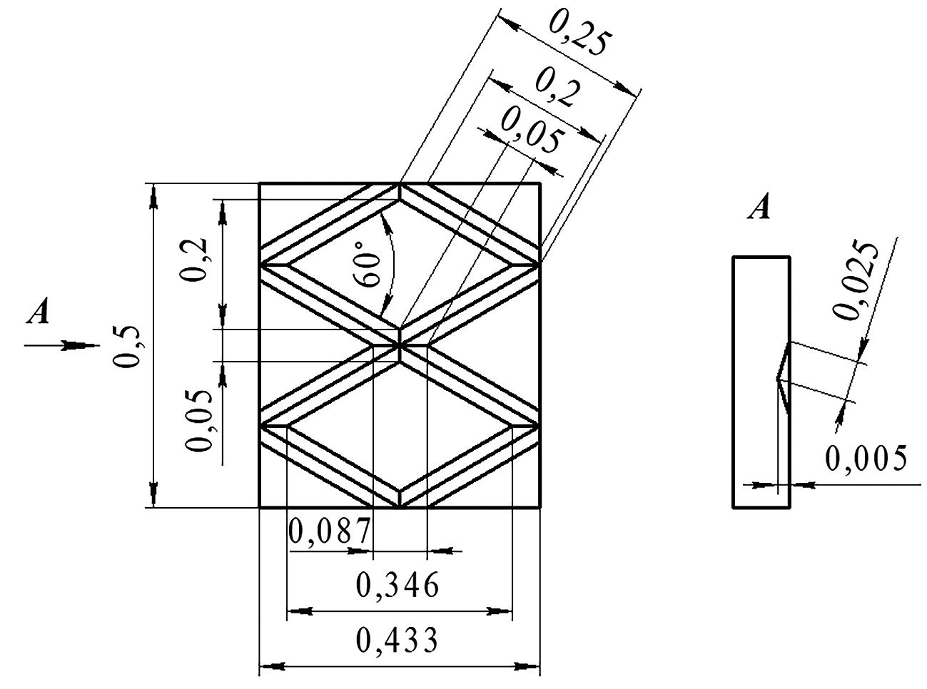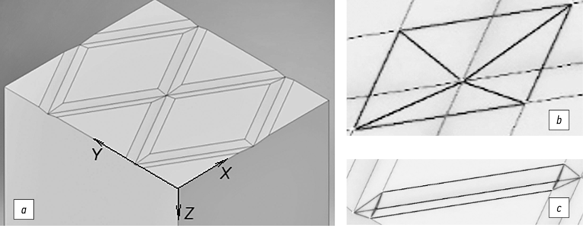 Из рис. 5 видно, что полуканавка на плоскости может быть представлена состоящей из восьми частей: четырех сторон длиной DС и четырех ромбов-узлов с большой диагональю AD.