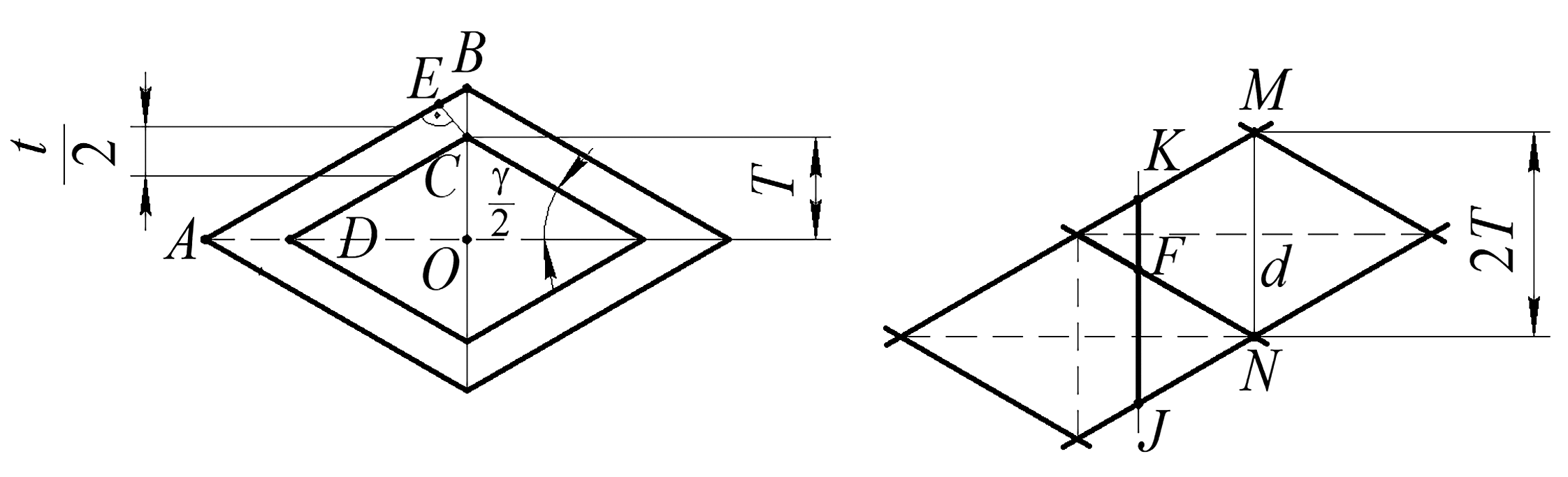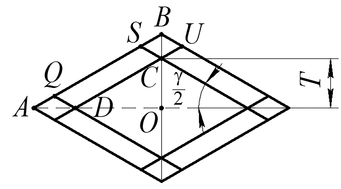 Для нахождения аналитической зависимости, описывающей суммарный объем полуканавки, применили дополнительную расчетную схему, которая получена из рис. 4 путем продления сторон внутреннего ромба до пересечения со сторонами ромба внешнего (рис. 5).