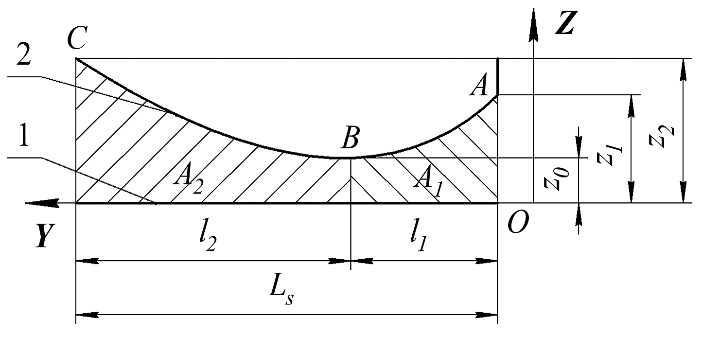 Используя обозначения характерных размеров сопряжения юбка поршня – цилиндр на рис. 6, выразили площадь А заштрихованной криволинейной трапеции под параболой АВС как сумму площадей А1 и А2 , соответственно, под дугами АВ и ВС формулой, являющейся более общим вариантом известной формулы Симпсона (справедлива для случая l1= l2):