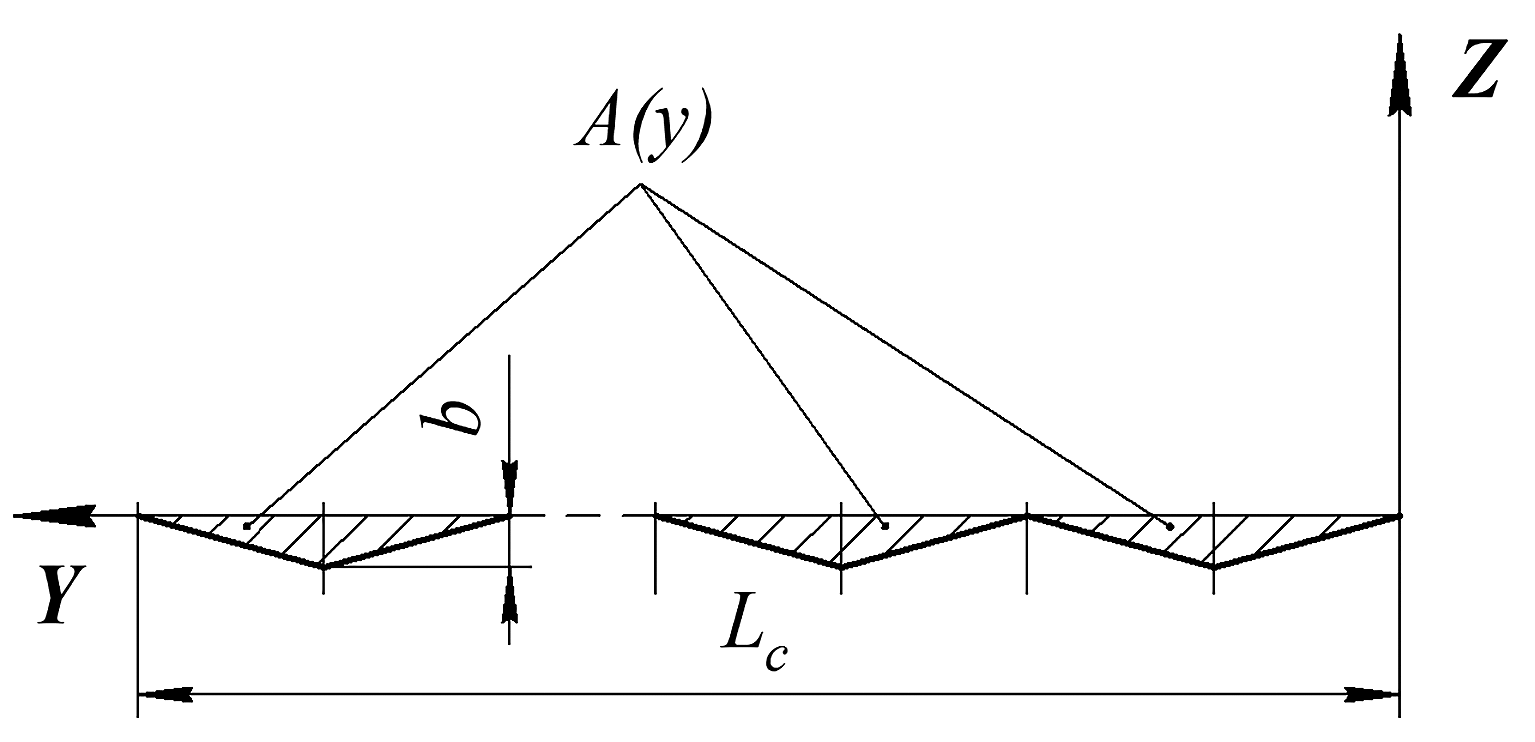 Для вывода формулы, определяющей объем масла во впадинах регулярного микрорельефа на юбке поршня (рис. 1), применили расчетную схему, представленную на рис. 7, согласно которой (поскольку суммарная площадь поперечного сечения канавок А(y) не зависит от координаты х) справедливо: