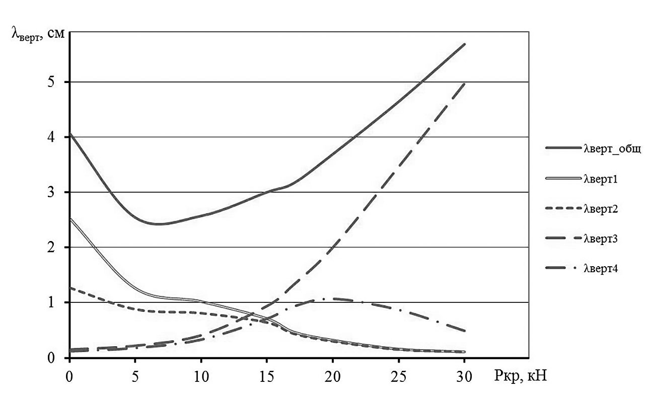 Рис. 1. Влияние крюковой нагрузки трактора на изменение вертикальных деформаций слоя почвы после прохода каждого опорного катка и общей деформации слоя λверт_общ. / Fig. 1. Tractor hook load impact on change of a soil layer vertical deformation after each lower track wheels pass and general deformation of the layer λверт_общ.