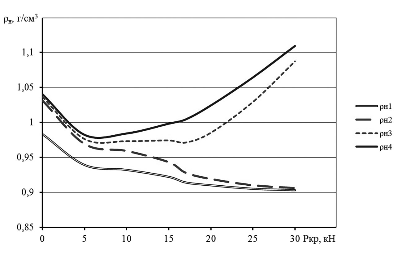 Основное увеличение плотности почвы при незначительной величине нагрузки на крюке трактора Ркр наблюдается после прохода первого и второго опорных катков (ρн1, ρн2). Отсутствие полной аналогии в развитии глубины колеи и плотности почвы под опорными катками гусеничного трактора объясняется неравномерным изменением коэффициента поперечной деформации слоя почвы. Подобная закономерность в изменении плотности почвы наблюдается и при больших значениях Ркр, однако основное уплотнение здесь происходит под задними опорными катками трактора.