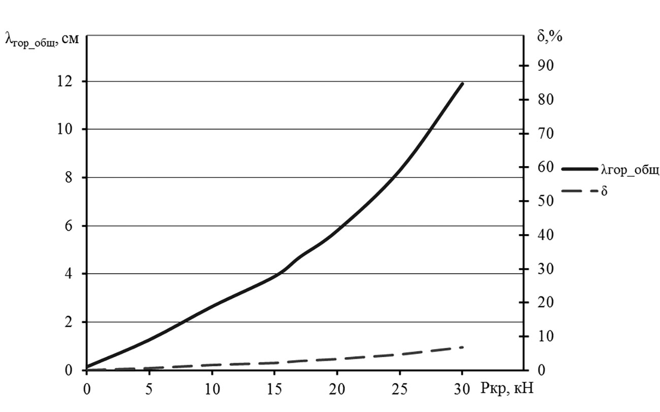 Рис. 3. Влияние крюковой нагрузки трактора на изменение общей горизонтальной деформации λгор_общ слоя почвы и буксования гусеничного движителя δ. / Fig. 3. Tractor hook load impact on change of a soil layer general horizontal deformation λгор_общ and slipping the crawler unit δ.