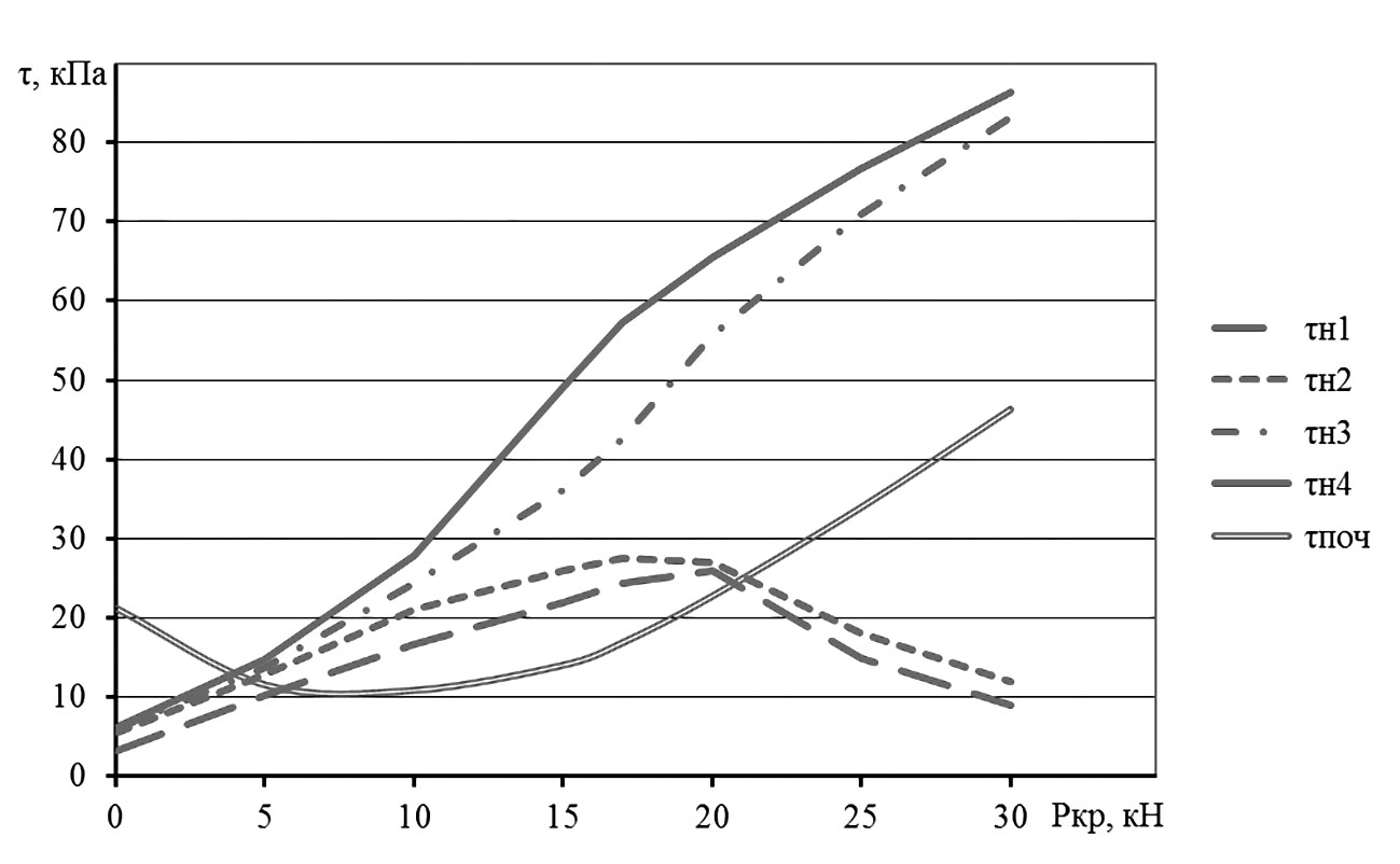 Влияние нагрузки на крюке трактора на изменение касательных напряжений τн1, τн2, τн3, τн4 в почвенном слое под каждым из опорных катков гусеничного движителя продемонстрировано на рис. 4.