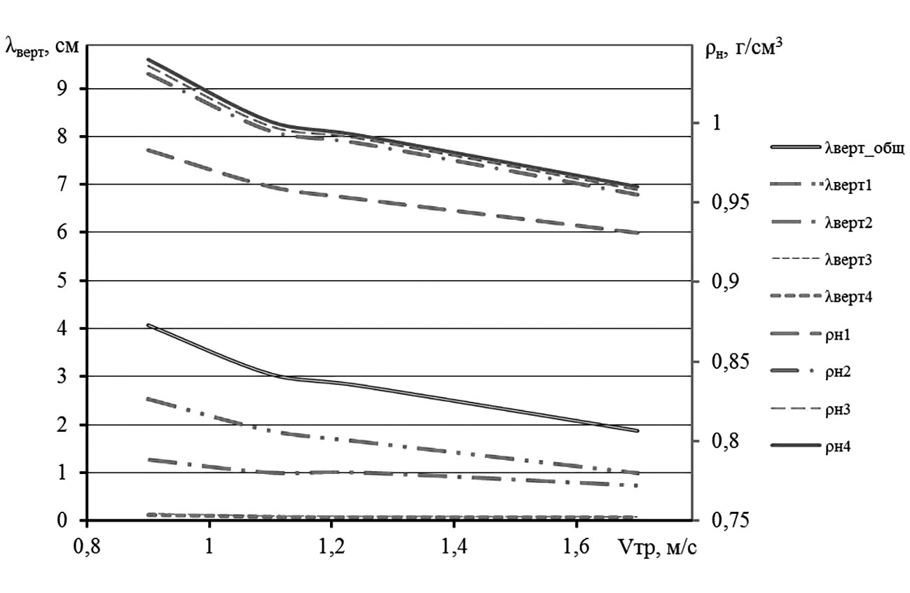 Рис. 5. Влияние скорости трактора на развитие вертикальных деформаций слоя λверт1 и плотности почвы ρнi под опорными катками трактора. / Fig. 5. Tractor velocity impact on the development of a soil layer vertical deformation λверт1 and of a soil compaction ρнi under lower track wheels.