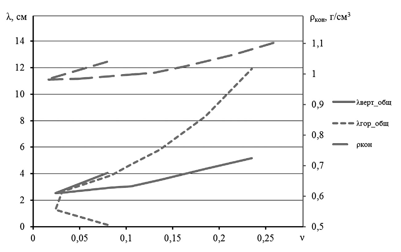 Рис. 6. Влияние коэффициента смещения центра давления гусеничного движителя ν на общую вертикальную деформацию слоя почвы λверт__общ, конечную плотность почвы ρкон и общую сдвиговую деформацию λгор_общ после прохода трактора. / Fig. 6. Impact of a shift factor of the crawler unit center ν on general vertical deformation of a soil layer λверт__общ, final soil compaction ρкон and general shear strain λгор_общ after a tractor pass.