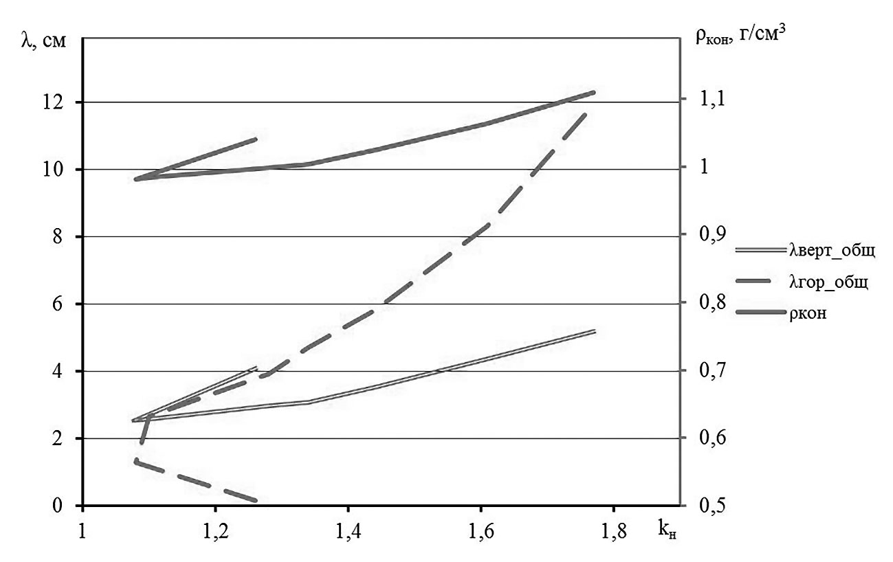 Рис. 7. Влияние коэффициента неравномерности распределения давления kн на общую вертикальную деформацию слоя почвы λверт__общ, конечную плотность почвы ρкон и общую сдвиговую деформацию λгор_общ после прохода. / Fig.7. Impact of a irregular press distribution coefficient kн on general vertical deformation of soil layer λверт__общ, final soil compaction ρкон and general shear strain λгор_общ after a tractor pass.