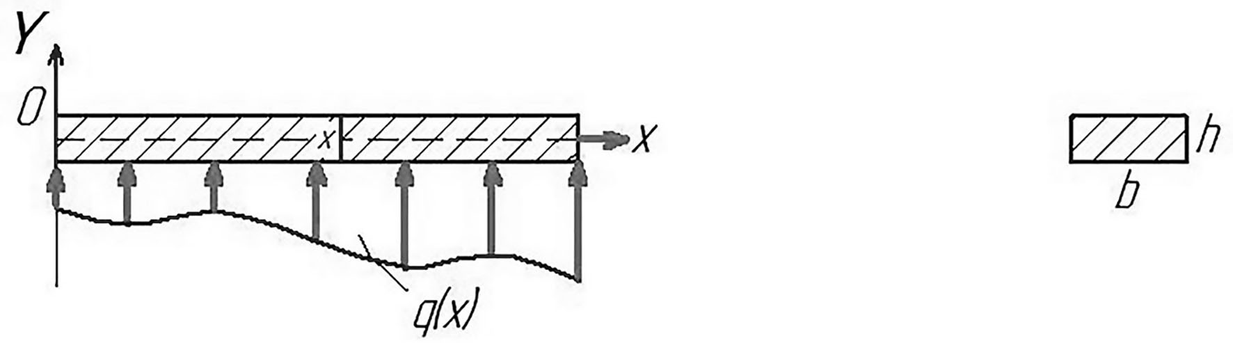 К балке приложена произвольная нагрузка , представляющая собой силу, отнесенную к единице длины балки (ее размерность ). Сечение балки в любом ее сечении представляет собой прямоугольник шириной и высотой (рис. 1,b), что соответствует геометрии реальных деталей. Если () – давление на поверхность балки, к которой приложена нагрузка , то