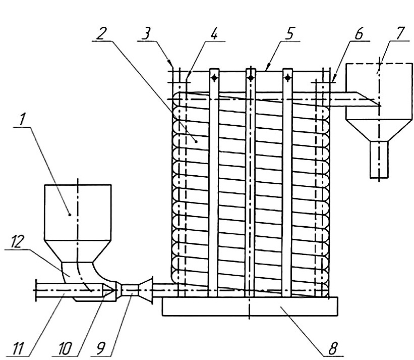 На рис. 1 проиллюстрирована схема аппарата для сушки зернистых материалов [7]. Установка включает в себя рукав 2, навитого вертикально по форме цилиндрической пружины растяжения, струйный насос, приемный бункер 1 и разгрузочное (газоотводящее) устройство 7 в виде осадочной камеры. Струйный насос состоит из подвода 12 перекачиваемого сырья (зернистого материала), подвода 11 внешнего потока (воздуха), сопла 10, в том числе камеры 9 смешения. Навитый рукав 2 вертикально (в виде полого цилиндра, установленного своим основанием на горизонтальную опору) установлен на основании 8. Навивка рукава 2 изготовлена с образованием его свободных, нижнего, а также верхнего концов, размещенных горизонтально. Газоподающий патрубок изготовлен в виде струйного насоса, камера 9 смешения которого скоммутирована с нижним концом рукава. Приемный бункер 1 сообщен с полостью подвода 12 к насосу перекачиваемого сырья, а разгрузочное устройство 7 – с верхним концом рукава 2. С целью сохранения формы рукава в виде навитой цилиндрической пружины растяжения в конструкцию аппарата включены наружные 3, а также внутренние направляющие стойки 4, установленные попарно, одна из которых закреплена с наружной, другая с внутренней стороны сформированного рукавом полого цилиндра. При этом указанные пары стоек 3 и 4 жестко смонтированы с основанием 8 и равномерно размещены по окружностям названного цилиндра. Количество пар стоек 3 и 4 может быть установлено в зависимости от диаметра цилиндра, например, равным восьми и более. Кроме того, свободные концы стоек 3 и 4 жестко скреплены между собой. При этом свободные концы диаметрально противоположных стоек 3, расположенных снаружи цилиндра, также жестко скреплены между собой. Соединение стоек 3 и 4, в том числе соединение стоек 3 между собой осуществлено, соответственно, при помощи коротких 6, а также длинных 5 стяжек в виде шпилек с гайками на их концах.