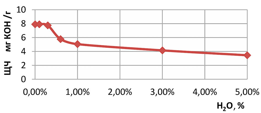На рис. 3 показано изменение щелочного числа в зависимости от степени обводненности. Щелочное число косвенно отражает динамику изменения концентрации пакета присадок, отвечающих за детергентно-диспергирующие свойства.