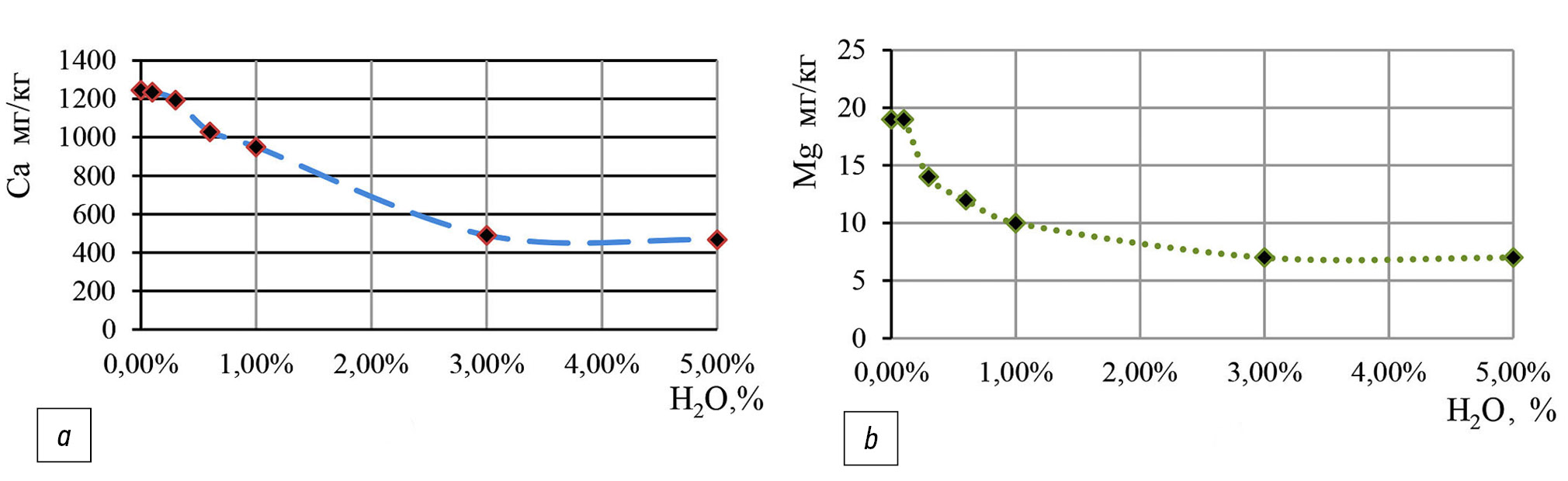 Внешне схожее изображение двух графиков объясняется их принадлежностью к одной присадке. При введении воды 0,1% происходит значительный спад массовой доли кальция и магния.