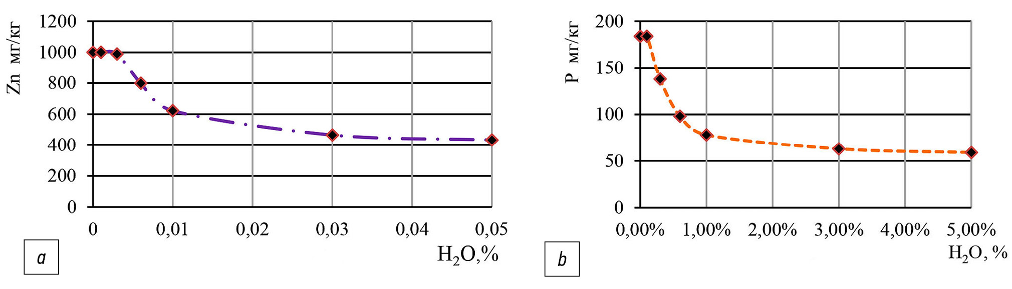 Рис. 5. Элементы-индикаторы присадок: а) массовая доля цинка (Zn); b) массовая доля фосфора (P). / Fig. 5. Indicator elements of additives: а) mass fraction of zinc (Zn); b) mass fraction of phosphorus (P).