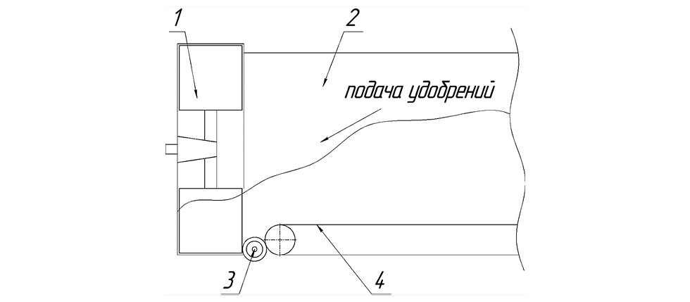Рис. 5. Схема подачи удобрений к рабочим органам: 1 – роторы разбрасывателя гранулированных удобрений; 2 – кузов разбрасывателя; 3 – шнек-питатель; 4 – транспортер. / Fig. 5. Scheme of fertilizer supply to the working bodies: 1 – granular fertilizer spreader rotors; 2 – spreader body; 3 – feeding screw; 4 – conveyor.