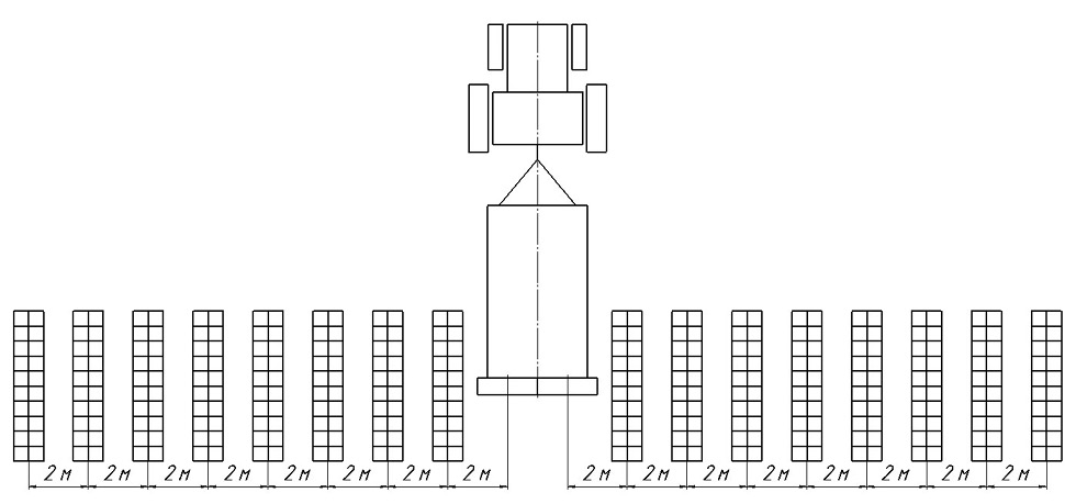 Для определения дальности разброса гранулированных удобрений роторным рабочим органом с горизонтальной осью вращения проводились исследования машины на стационаре. Для этого расставили пробоотборники размером 0,5×0,5 м в 8 рядов каждые два метра от осей вращения роторов (рис. 6). Кузов машины был наполнен гранулированным карбамидом, коэффициент трения по металлу которого составляет 0,31.