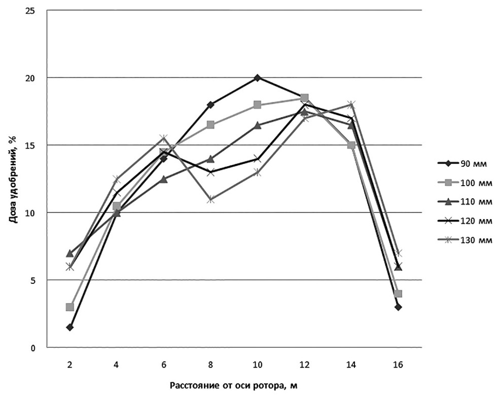 Наиболее равномерное распределение удобрений получается при внесении их роторным рабочим органом с лопастями длиной 110 мм. При этом наблюдается общая для всех вариантов тенденция к наиболее плотному потоку материала ближе к краю распределения относительно центра полосы рассева (на расстоянии 12–14 м от оси вращения ротора). Наименьшая доза удобрений во всех рассматриваемых случаях оказалась в непосредственной близости к машине, а также за выраженным пиком дозы внесения (на расстоянии более 14 м от оси вращения ротора).