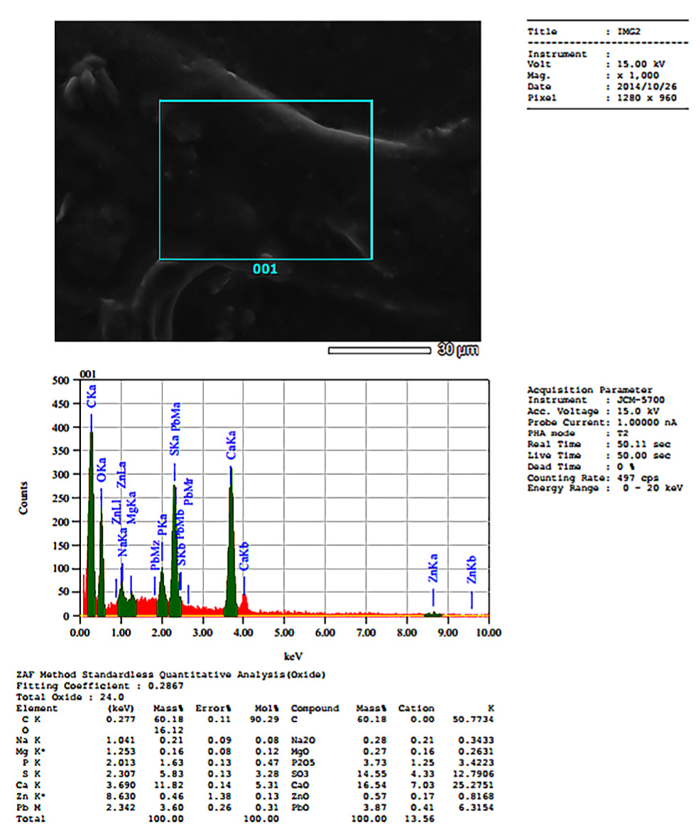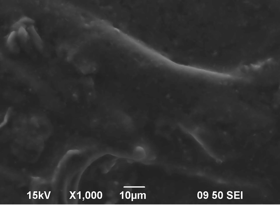 Полученный образец исследовался на растровом электронном микроскопе Jeol JCM-5700 в режиме высокого вакуума. Тип сигнала – вторичные электроны (SEI).