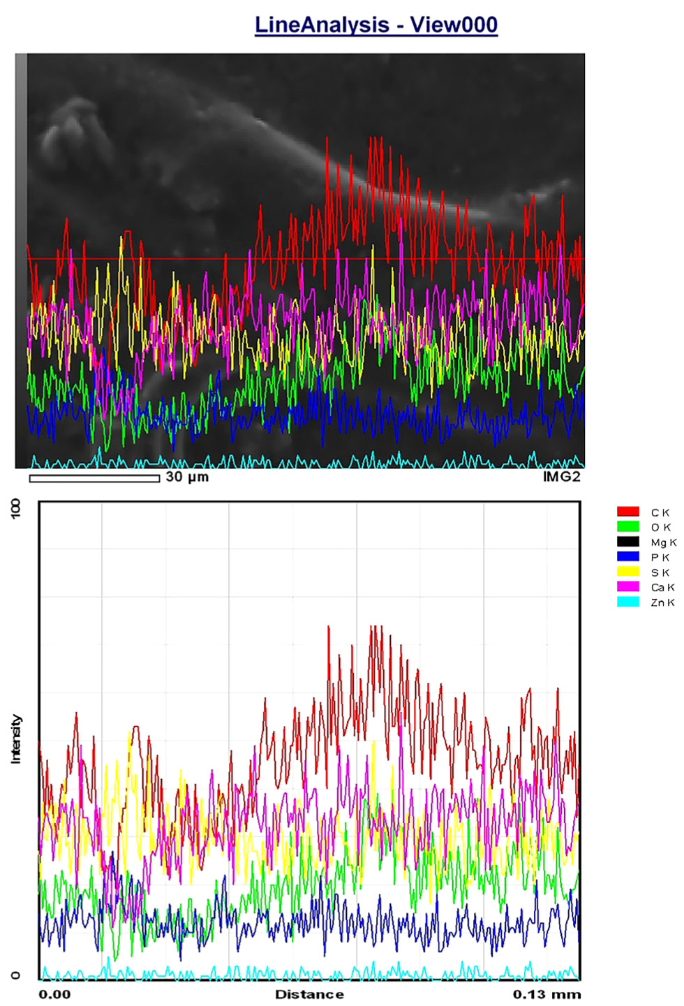 Фазовый анализ образца со спектральным распределением интенсивностей сигналов химических элементов представлен на рис. 5. Были обнаружены элементы-индикаторы присадок: кальций, магний, цинк, фосфор.