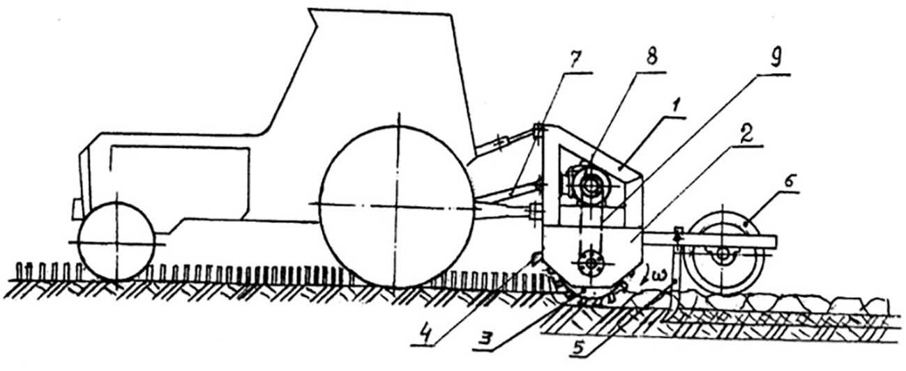 Рис. 2. Агрегат для измельчения корневой системы: 1 – рама; 2 – кожух; 3 – режущий нож; 4 – противорежущий нож; 5 – чизель-разрыхлитель; 6 – каток; 7 – карданный вал; 8 – конический редуктор; 9 – боковая передача