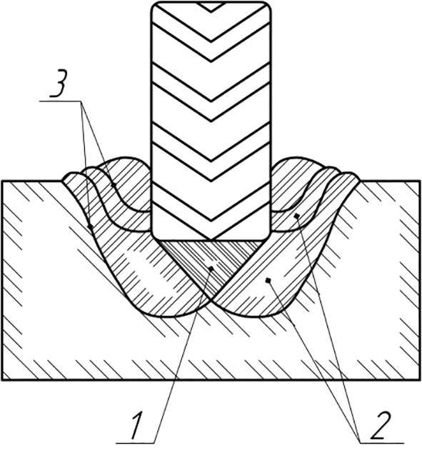 Рис. 1. Схема образования ядра уплотнения в почве под движителем мобильной сельскохозяйственной техники: 1 – ядро уплотнения почвы; 2 – зоны сдвигов; 3 – площадки скольжения