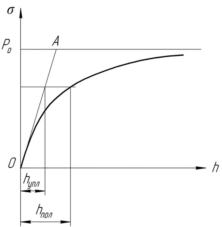 При деформировании почвы наряду с ее уплотнением имеет место и сдвиг (рис. 1). Зависимость между напряжением σ и деформацией h подчиняется функции гиперболического тангенса, при этом интенсивность роста напряжения отстает от деформации (рис. 2) [5]: