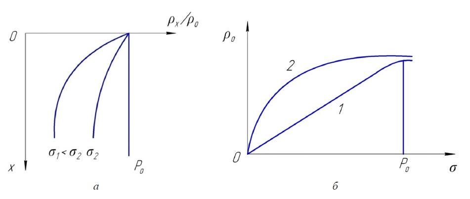 Зависимость (6) получена исходя из предположения, что распределение напряжений и плотности почвы по глубине не зависит от величины давления. Однако известно [7], что если давление достигает величины предела несущей способности почвы, плотность в образовавшемся ядре уплотнения одинакова по глубине. Распределение плотности почвы по высоте сжатого ядра в этом случае изобразится прямой линией, параллельной оси ординат (рис. 3, а), что соответствует характеру протекания пластических деформаций. Поэтому при контактных напряжениях, близких к пределу несущей способности почвы, зависимость (5) может отклониться от пропорциональной (рис. 3, б, линия 1).