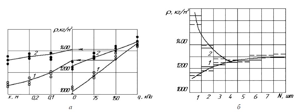 Рис. 3. Зависимость плотности почвы от напряжения: а – по глубине; б – верхнего слоя; 1 – с возможностью бокового расширения; 2 – без возможности бокового расширения