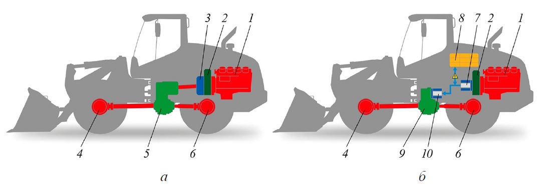 Рис. 1. Принципиальная схема трансмиссии фронтального погрузчика с гидромеханической (а) и электромеханической (б) трансмиссией: 1 – ДВС; 2 – коробка отбора мощности; 3 – гидротрансформатор; 4 – передний мост; 5 – коробка передач; 6 – задний мост; 7 – тяговый генератор; 8 – накопитель электрической энергии; 9 – раздаточная коробка; 10 – тяговый электродвигатель