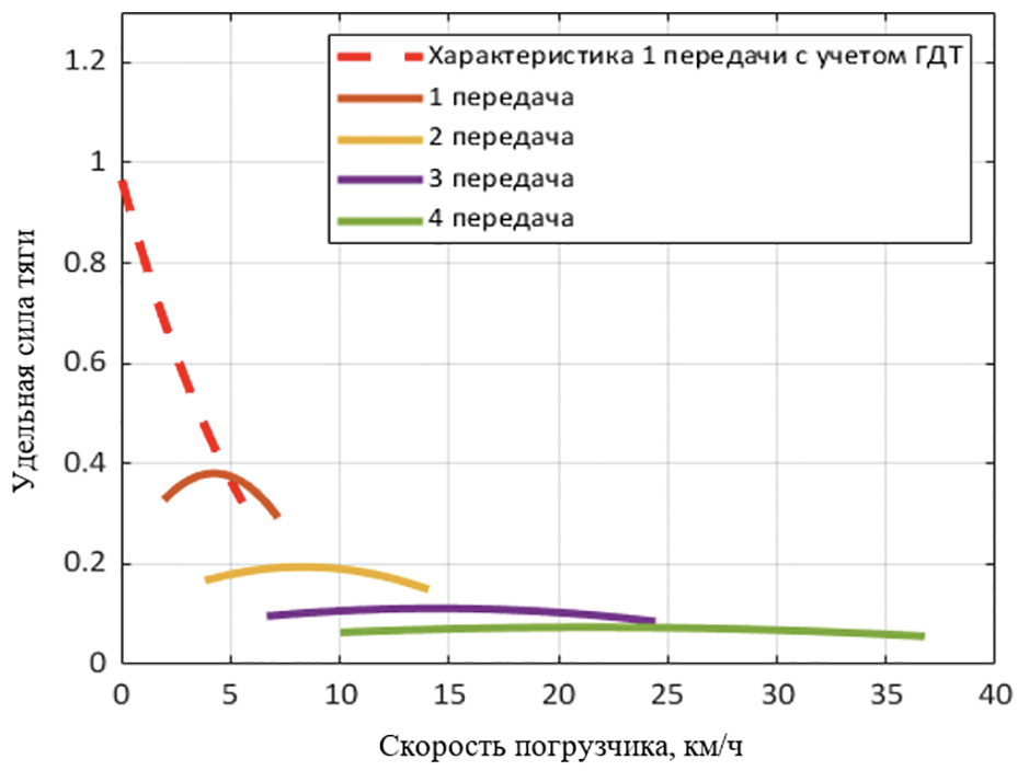 Эксплуатируемые в настоящее время фронтальные погрузчики имеют максимальную удельную силу тяги 1–1,1, однако она обеспечивается при максимальном коэффициенте трансформации гидротрансформатора и не может поддерживаться длительное время (рис. 2).