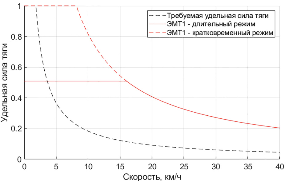 Тяговые электродвигатели (ЭД) способны некоторое время работать с крутящим моментом выше номинального (до двух раз выше), что позволит транспортной машине с ЭМТ кратковременно реализовывать большую силу тяги. Исходя из анализа тяговой характеристики фронтального погрузчика с ГМТ на рис. 2 предлагается сформировать следующие требования к удельной тяге: в кратковременном режиме работы – = 1, в длительном режиме – = 0,51 (необходимо для длительного выполнения бульдозерной операции).