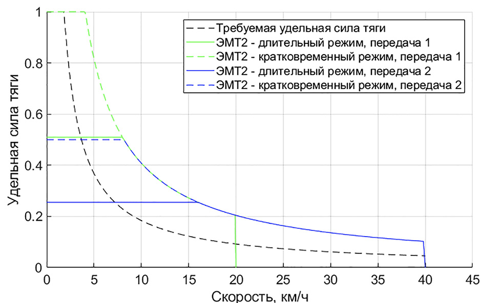 В данном случае следует пойти на некоторое усложнение конструкции: она будет иметь два фиксированных передаточных отношения. Для дальнейшего расчета примем, что скорость, обеспечиваемая на низшей передаче (на той же, где обеспечивается технологический режим), должна составлять не менее 20 км/ч [7]. В таком случае может отсутствовать необходимость переключать передачи на ходу, что упростит конструкцию трансмиссии. Результаты расчета ЭМТ с двумя передаточными отношениями представлены на рис. 4 и в табл. 3.