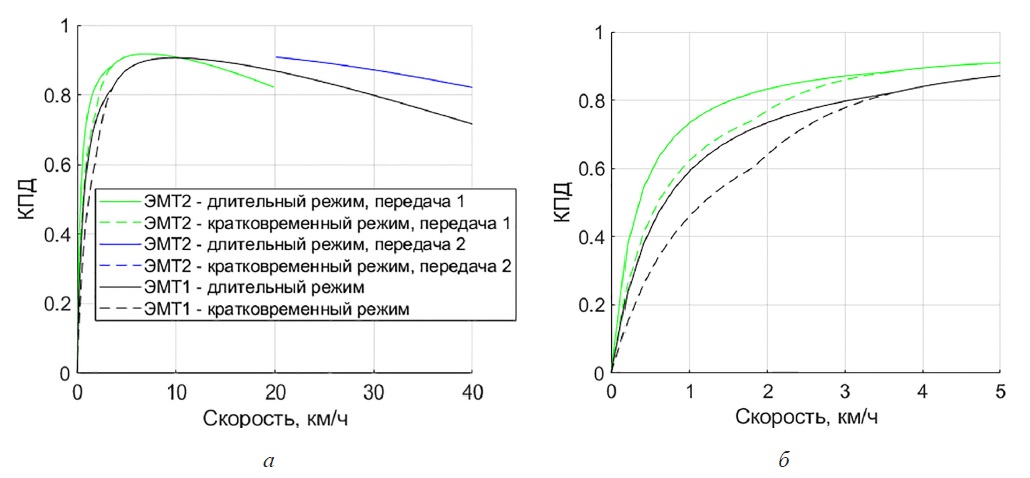 Рис. 5. КПД электродвигателя для ЭМТ погрузчика с одним и двумя передаточными отношениями (а), КПД укрупненно для малых скоростей движения (б)