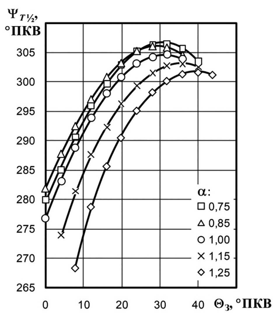 Характерной особенностью данной зависимости является наличие максимума. Причем его угловое положение и величина фазы в экстремуме зависят от состава смеси: чем богаче смесь, тем больше фаза и меньше УОЗ, при котором наблюдается максимум. Последнее справедливо только до области мощностного состава. При дальнейшем обогащении максимум начинает смещаться в сторону увеличения УОЗ. Общим для всех представленных зависимостей является то, что максимумы лежат правее относительно оптимальных УОЗ приблизительно на 3…5° ПКВ, то есть вне области реализуемых на практике УОЗ.