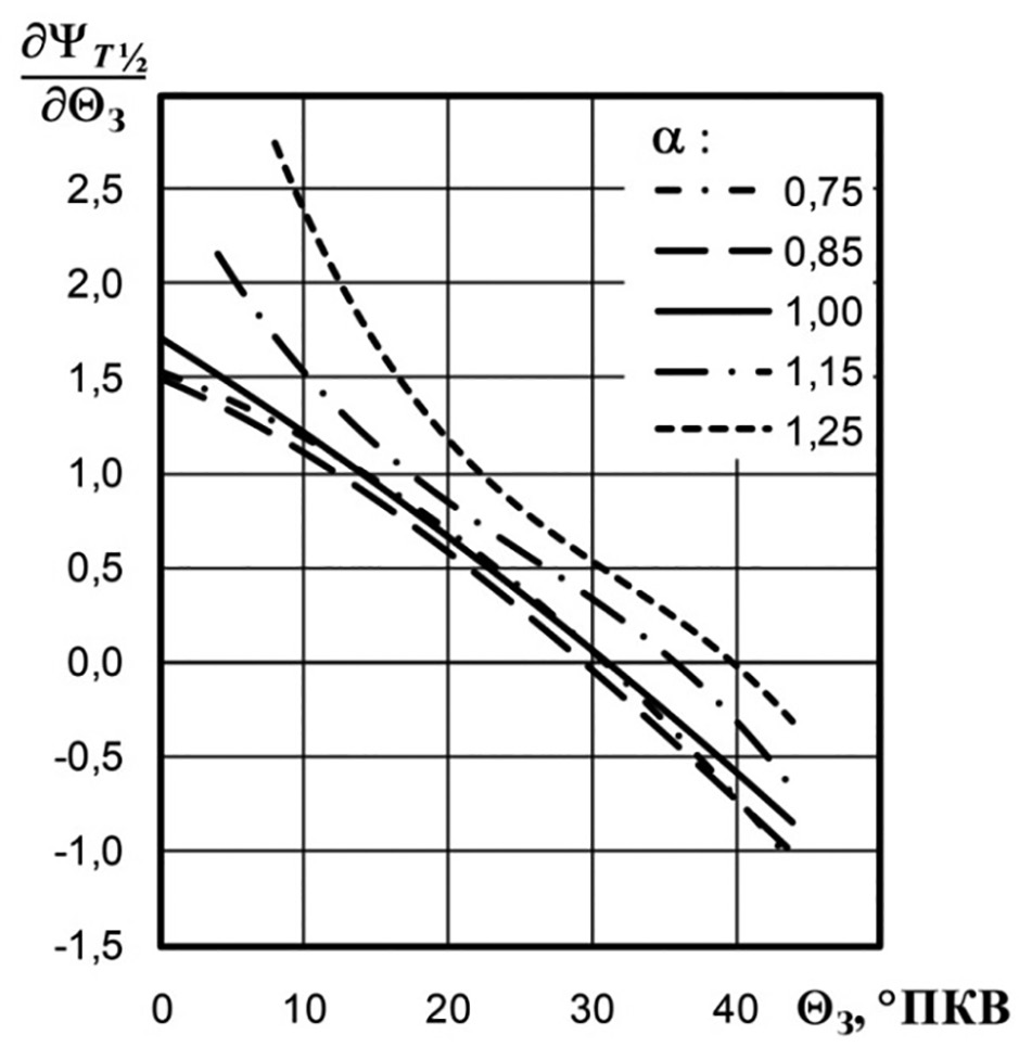3. Fig. 2. Dependence of the derivative with respect to the ignition timing of the phase of the fundamental harmonic of the kinetic energy of the crank mechanism on the ignition timing at n = 2000 min–1, load of about 50 % and different mixture compositions