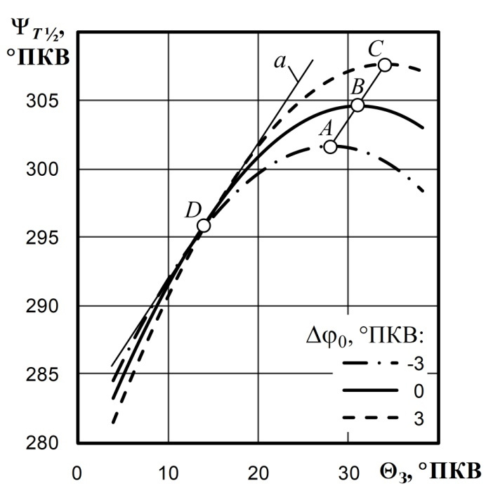 По этим же графикам можно получить представление о величине смещения. Наиболее надежно оно определится по разности значений фазы в соответствующих экстремумах (точки A, B и C на рис. 4): при смещении в 3° ПКВ – ∆φ0 = ΨT ½ C – ΨT ½ B; при смещении в ‍–‍3° ПКВ – ∆φ0 = ΨT ½ A – ΨT ½ B. Таким образом, в условиях эксплуатации необходимо сначала выполнить оценку состава смеси при нивелирующем действии смещения шкалы УОЗ (в области максимума (ΨT ½ – Θз)) и затем, не меняя состава смеси, найти максимальное значение ΨT ½ и по его разности с максимальным значением ΨT ½ 0 для данных условий определить смещение шкалы. «Узким местом» предложенной процедуры является необходимость в сохранении постоянства состава смеси при варьировании УОЗ, что не всегда может быть соблюдено на практике. Поэтому не следует ограничиваться только данным способом.