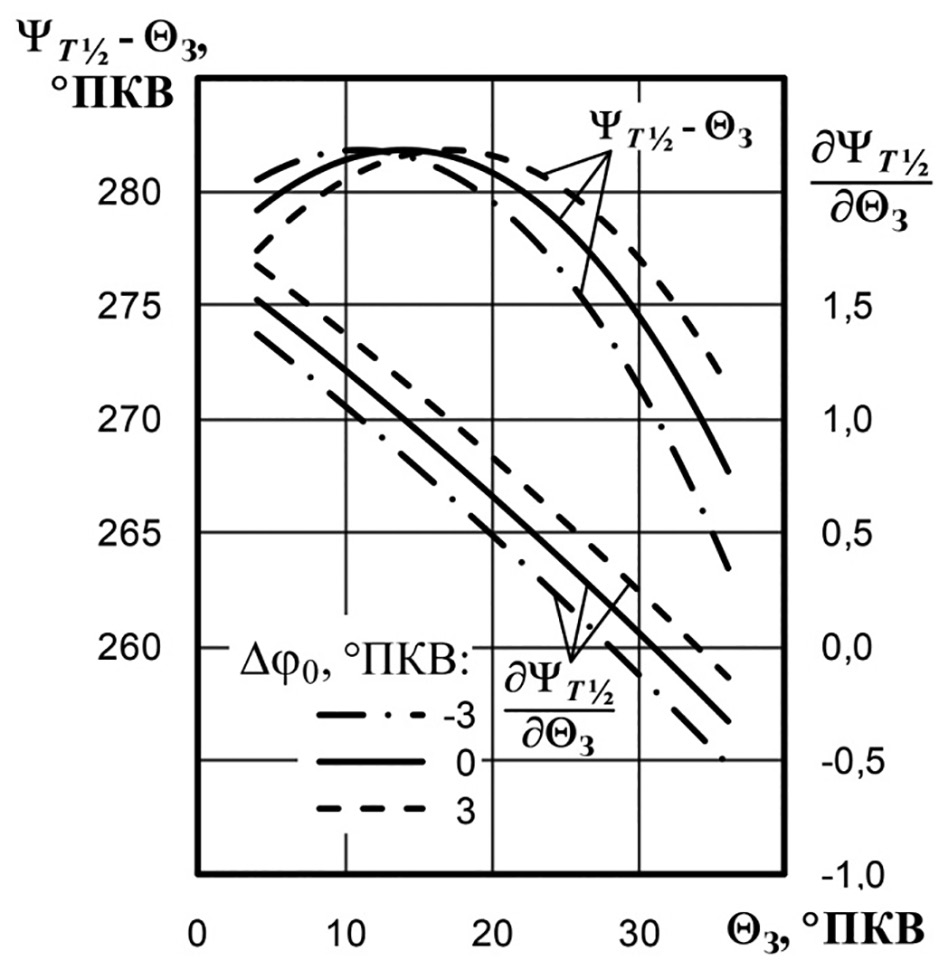 Пример влияния смещения ∆φ0 угловой шкалы на зависимость ΨT ½ = fз) показан на рис. 4. Кривые при ∆φ0 = ±3° ПКВ (половина шага одноименных секторов диска синхронизации) получены из исходной зависимости путем ее сдвига по координатным осям на величину смещения. Исходная зависимость, в свою очередь, построена по сглаженным данным рис. 1 для стехиометрического состава смеси. Вблизи Θз = 14° ПКВ, где производная фазы по УОЗ равна 1, наблюдается минимальное расхождение в значениях ΨT ½ при наличии смещения и без него. Таким образом, на рассматриваемом режиме при номинальном (не фактическом) УОЗ около 14° ПКВ смещение угловой шкалы в пределах ±3° ПКВ не вызовет значимого изменения фазы основной гармоники кинетической энергии КШМ.