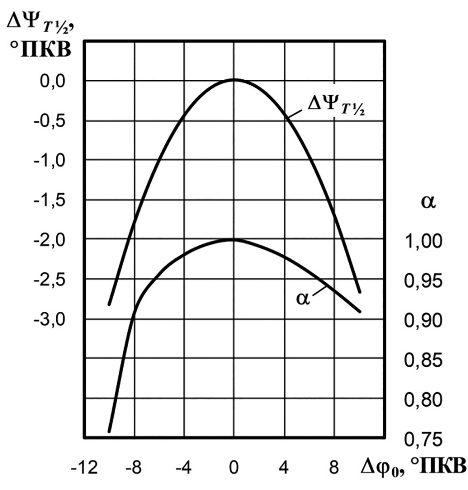 7. Fig. 6. The influence of the displacement of the angular scale on the phase deviation of the fundamental harmonic of the kinetic energy of the crank mechanism at α = 1 and regulation of the mixture composition with a phase regulator (n = 2000 min–1, load of about 50 %)